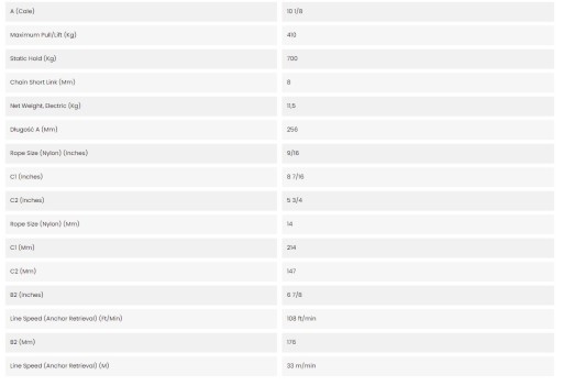 Estetyczna konstrukcja powyżej pokładu, zamykająca silnik i napęd w wodoszczelnej obudowie, oszczędzając miejsce pod pokładem i umożliwiając prostą rutynową konserwację. Prosty montaż „przykręcany” zapewnia łatwą i szybką instalację na pokładzie. Wysokowydajna przekładnia walcowa wyposażona w solidny mechanizm zapobiegający zacięciom wstecznym. Szybkie i wolne od zacięć odzyskiwanie liny i łańcucha sterowane za pomocą zdalnego panelu zamontowanego w górę/w dół switchEmergency. Funkcja „swobodnego upadku” w przypadku awarii zasilania na pokładzie. Aktywowany za pomocą dostarczonej dźwigni awaryjnej „Free Fall”. Wytrzymały, dwukierunkowy silnik z nowymi funkcjami technologicznymi, w tym zintegrowanym okablowaniem do szybkiej instalacji elektrycznej. Najlepiej nadaje się do łodzi do 10 m.