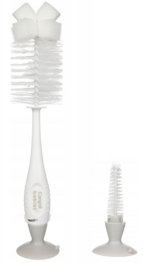Praktyczna szczotka ułatwia mycie butelek i smoczków. Większa szczotka posiada gąbkę, która pozwala na wygodne mycie dna butelek. Mniejsza, ukryta w końcówce z przyssawką, nadaje się do czyszczenia smoczka z resztek mleka lub kaszki. Szczotka posiada specjalną przyssawkę, która umożliwia stabilne ustawienie szczotki na gładkim podłożu.