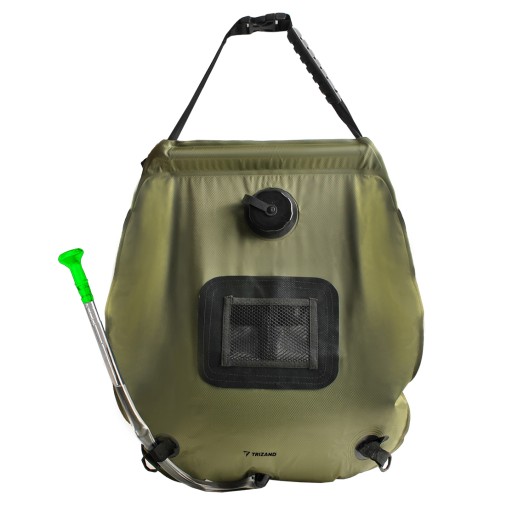 - PRAKTYCZNY – posiada podwójną kieszonkę, która pozwala na przechowywanie drobnych rzeczy potrzebnych do kąpieli, np. szampon, żel. Po bokach znajdują się zaczepy na rzep – jeśli chcemy by kranik był do góry wystarczy go zaczepić. Kran posiada prysznicową końcówkę 40 centymetrową, którą wystarczy wysunąć, by woda zaczęła lecieć, a po skorzystaniu wystarczy zamknąć dopływ wody. W górnej części znajduje się również gumowa rączka umożliwiająca wygodne przenoszenie, a także zawieszenie, po obu stronach w dolnej części są również 2 uchwyty, dzięki którym zabezpieczymy mocniej zawieszenie np. przy użyciu sznurka do drzewa; mogą posłużyć nam również do zaczepienia kosmetyczki, bądź innych gadżetów.