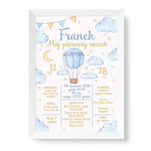 • W zestawie znajduje się biała ramka oraz plakat z papieru wysokiej jakości. Plakat zdobi balon, chmurki, księżyc, całość zachowana jest w niebieskiej kolorystyce. Personalizacji podlega: imię dziecka, data i godzina urodzenia, waga w gramach i wzrost w centymetrach w dniu narodzin, co uwielbia, mówi, ile ma ząbków, ulubione jedzenie, bajka, zabawka, co robi, data pierwszego ząbka, data kiedy dziecko pierwszy raz usiadło, pierwsze słowa i data, drugie słowo i data.