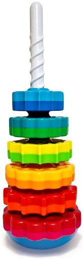 Podstawa wieży jest dwu-strona – może stać stabilnie lub kołysać się jak wańka-wstańka. Kręcące się tarcze w kształcie gwiazd są dwukolorowe – wirując tworzą kolorową tęczę. Dziecko może układać krążki od największego do najmniejszego lub kreatywnie stworzyć swoją konstrukcję.
