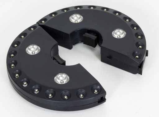 Oświetlenie LED do parasola ogrodowego może służyć również jako lampa kempingowa.