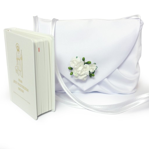 Torebka komunijna - kopertówka. Oferujemy torebkę komunijną dla dziewczynki. Jest to biała torebka typu kopertówka z ozdobnym marszczeniem oraz przypinką kwiatową, którą można umieścić w dowolnym miejscu. Zamknięcie torebki na rzep. Torebka przeznaczona jest do noszenia na ramieniu, w tym celu jest wyposażona w satynowy paseczek. Do torebki swobodnie zmieści się książeczka do modlitwy, różaniec, chusteczki. Torebkę można prać w pralce.