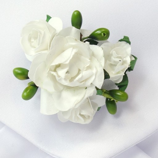 Przypinka składa się z różyczek w kolorze ecru, z zielonym dodatkiem. Wykonana jest z materiałów papierniczych i sztucznych dlatego nie należy dopuścić do jej zamoczenia.