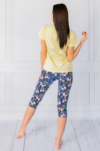 Bawełniana piżama damska z kolekcji Mustique z krótkim rękawem i szortami. Spodenki w żywych barwach we wzór motyli w komplecie z koszulką w pastelowym odcieniu, z delikatnym nadrukiem w górnej części, idealnie się ze sobą komponują. Ta piżamka to propozycja w sam raz na nadchodzące ciepłe dni.