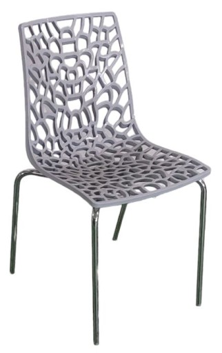 Krzesło włoskie w kolorze szarym z ażurowym wzorem na oparciu i siedzisku na chromowanym stelażu. Model wykonany z nietoksycznego tworzywa bez PAH.