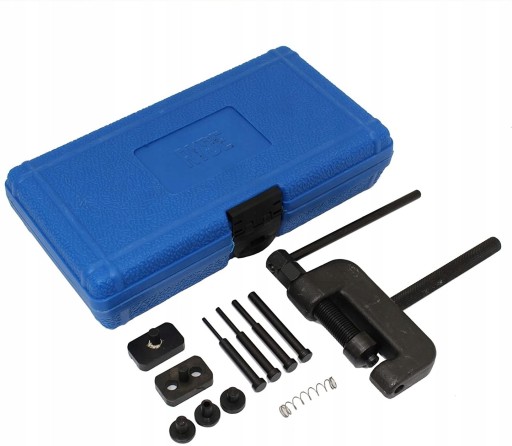 Zakuwarka-nitownica do łańcuchów motocyklowych. Przeznaczona do zakuwania i rozkuwania łańcuchów rozrządu oraz łańcuchów napędowych. Zestaw przydatny w warsztatach motocyklowych, rowerowych i samochodowych.