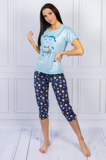Bawełniana piżama młodzieżowa posiada koszulkę z krótkim rękawem, w kolorze jasnego turkusu z uroczym nadrukiem i okrągłym dekoltem zakończonym lamówką oraz spodnie długości za kolano, w księżyce i chmurki na granatowym tle. Komplet wykonany z najwyższej jakości materiałów, gwarantuje zdrowy i wygodny sen.