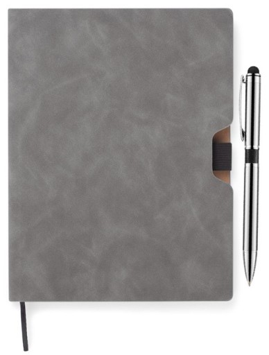 Klasyczny notes w okładce z ekoskóry w szarym kolorze. Czarne krawędzie kartek nadają mu elegancki wygląd. Notes zawiera 80 białych kartek w linie wykonanych z papieru FSC. Okładka posiada gumkę - uchwyt na długopis oraz czarną zakładkę - wstążeczkę
