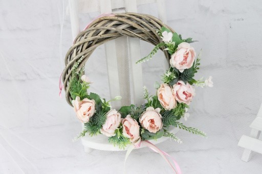 Wianek wiklinowy szary o średnicy 25cm udekorowany kwiatami piwonii w odcieniach jasnego różu.