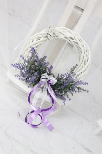 Cudowny biały wiklinowy wianek o średnicy 20cm, udekorowany kwiatami lawendy, tasiemkami oraz drewnianą ozdobą ażurowego motylka.