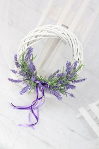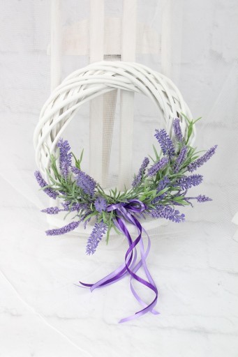 Piękny biały wiklinowy wianek o średnicy 25cm, udekorowany kwiatami lawendy oraz tasiemkami.