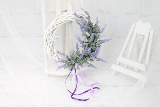 Śliczny biały wianek wiklinowy 25cm, ozdobiony asymetrycznie delikatnymi gałązkami lawendy, tasiemkami oraz drewnianą ozdobą ażurowego motylka.