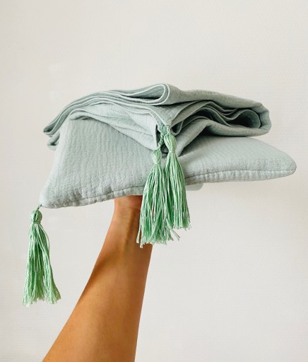- Otulacz wyposażony w dwa dekoracyjne chwosty, wykonane przez nas ręcznie, co nadaje mu dodatkowego uroku.