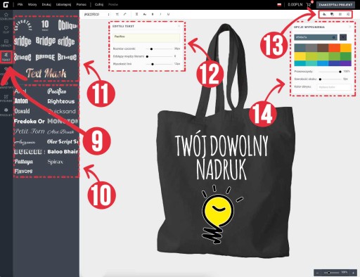 9️⃣ (9) - Oczywiście podstawowe funkcje jak zmiana koloru tekstu, pogrubienie, kursywa, podkreślenie, zamiana jednym przyciskiem myszy z napisów pisanych dużą literą na małą i odwrotnie oraz zmiana odstępów i innych parametrów napisów możliwa jednym przyciskiem myszy. Bardzo ważne jest, że w naszym kreatorze wszystkie fonty posiadają polskie znaki (ą,ę,ź,ć,ó)
