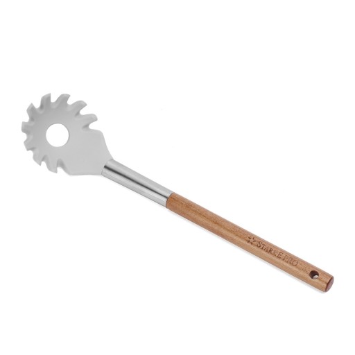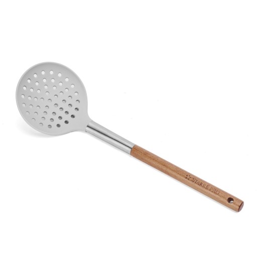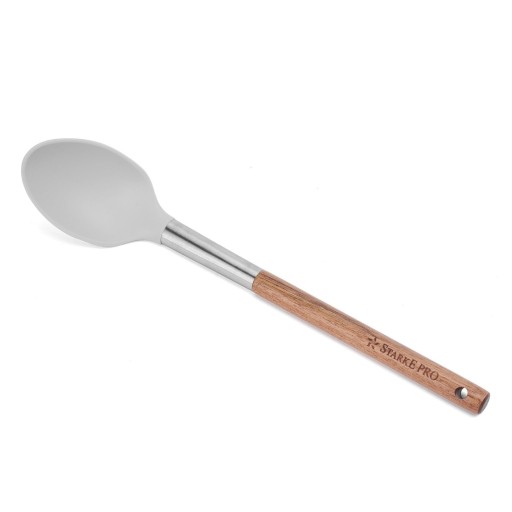 Zestaw przyborów kuchennych Starke Pro Acacia Silico 5 elementów (łopatka, łyżka z zębami i otworem, szumówka, łyżka klasyczna i chochelka) pomogą szybciej i wygodniej przyrządzić oraz podać różne dania. Końcówki powstały z silikonu, do którego nic nie przywiera. Łatwo je umyć. Uchwyty z drewna akacjowego są stabilne i nie nagrzewają się, zapewniając bezpieczeństwo. Silikon, drewno bambusowe i stal nierdzewna (łącznik) są trwałe i odporne, a przy tym świetnie się prezentują. Będą świetną inspiracją na gustowny prezent.