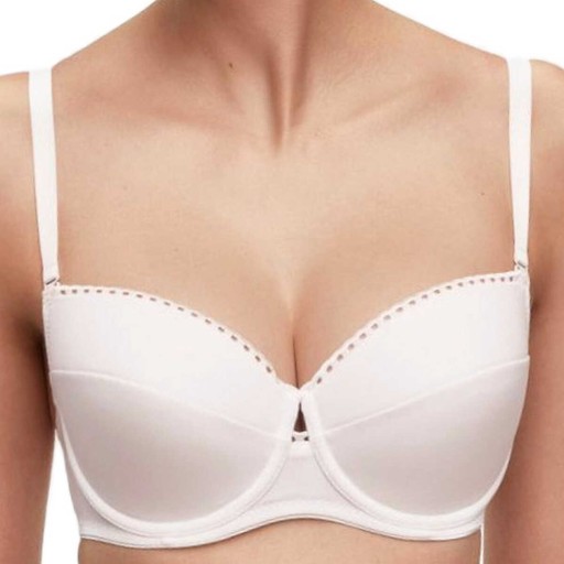 Biustonosz na fiszbinach. Miseczki usztywniane. Klasyczny, prosty krój. Uroku całości dodaje oryginalna lamówka przy dekolcie. Odpinane ramiączka o regulowanej długości. Tył i boczki z jednolitej, gładkiej tkaniny. Zapięcie trójstopniowe na dwie haftki.