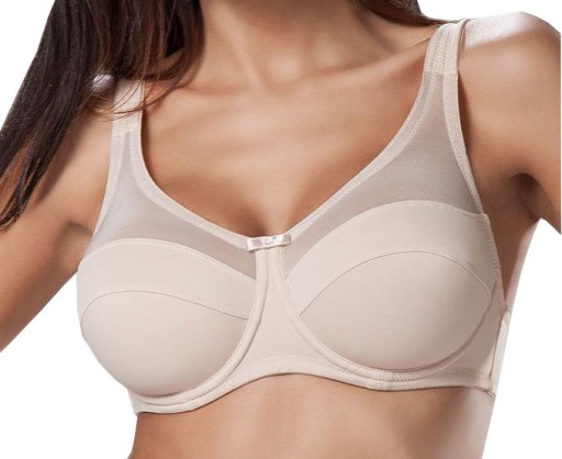 Komfortowy biustonosz na fiszbinach dobrze podtrzymujący większy biust, standardową miseczkę połączono z delikatnym tiulem, miseczki dodatkowo wyścielone bawełną, szerokie ramiączka wzmocnione bawełną oraz miękką pianką, trzyrzędowe zapięcie.