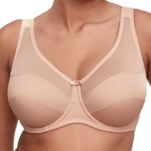 Komfortowy biustonosz na fiszbinach dobrze podtrzymujący większy biust, standardową miseczkę połączono z delikatnym tiulem, miseczki dodatkowo wyścielone bawełną, szerokie ramiączka wzmocnione bawełną oraz miękką pianką, trzyrzędowe zapięcie.