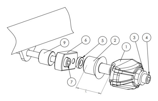 - Dokręć ślizgacze (1) oraz korpusy cylindryczne (2) do adapterów, używając śrub klasy 8,8 (4), podkładek stalowych (3) i tulei dystansowych (5).
