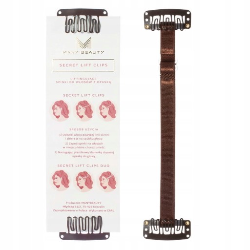 Spinki do ekspresowego liftingu twarzy. Doskonale sprawdzają się podczas specjalnych okazji oraz sesji zdjęciowych. Stanowią rozwiązanie, dzięki któremu w szybki i nieinwazyjny sposób można wyglądać pięknie i młodo. Produkt jest niezwykle prosty w użyciu, wystarczy przypiąć spinki na skroniach i naciągnąć opaskę.