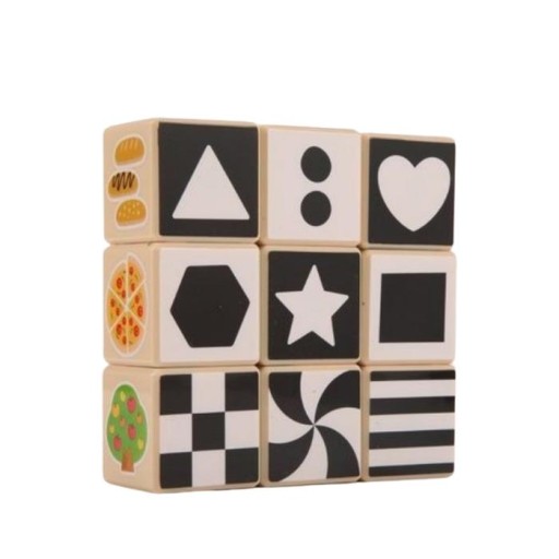 - nadrukowane czarno-białe kontrastowe obrazki na sześciennych klockach – mają korzystny wpływ na rozwój mózgu