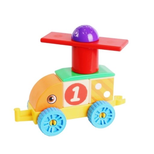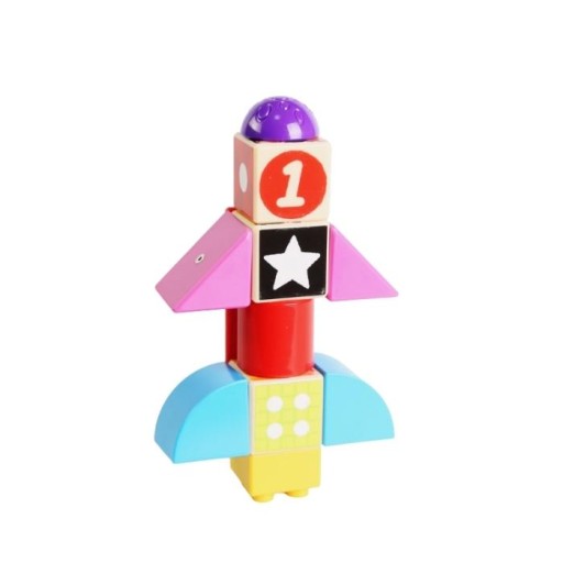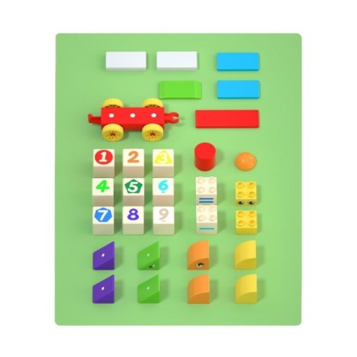 - różne kształty klocków (w tym sześciany, płytki, walec, element z ruchomymi kołami, elementy z zaokrąglonymi kształtami) – pozwalają na tworzenie płaskich i przestrzennych figur, a także na konstruowanie liter alfabetu i cyfr