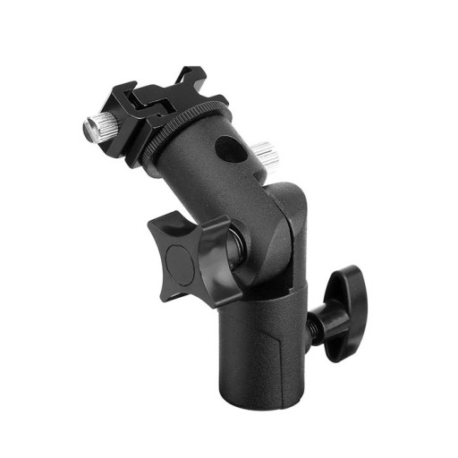 Uniwersalny uchwyt pozwalający na zamontowanie lampy błyskowej na statywach oświetleniowych z głowicą 16mm. Dzięki temu zewnętrzna lampa błyskowa unika błysku równoległego do osi optycznej obiektywu.