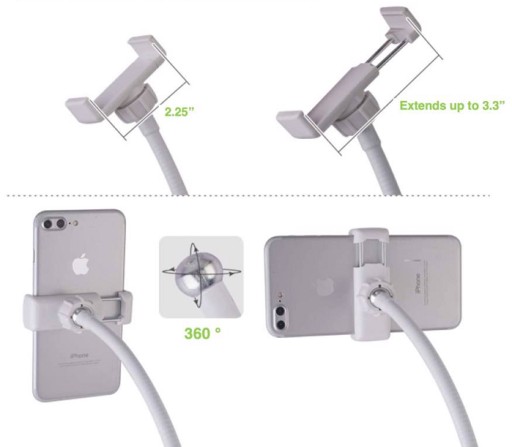 Obracający się o 360° uchwyt na telefon, pozwalający wybrać idealny kąt, zasilany przez USB, podłączany do komputera, ładowarki lub power banku. Super mocny zacisk bezpieczne mocowany do mebli, takich jak biurka, stoły itp.