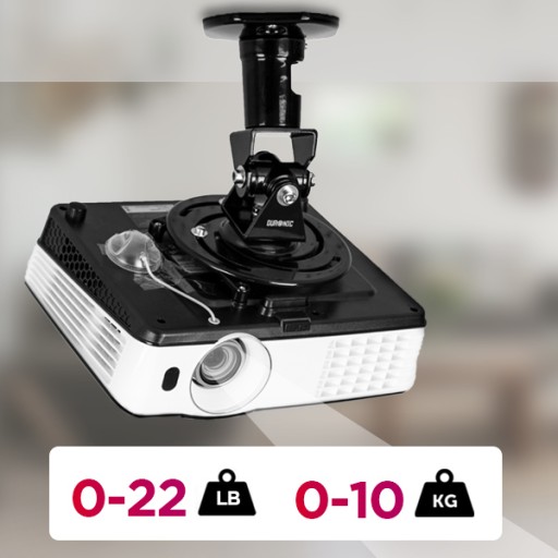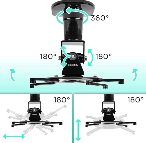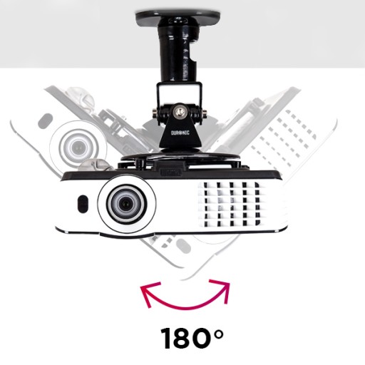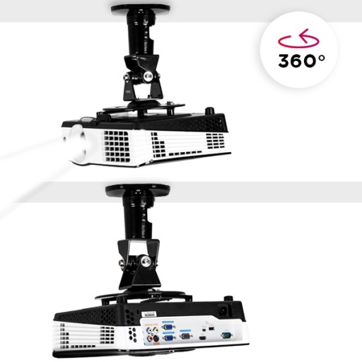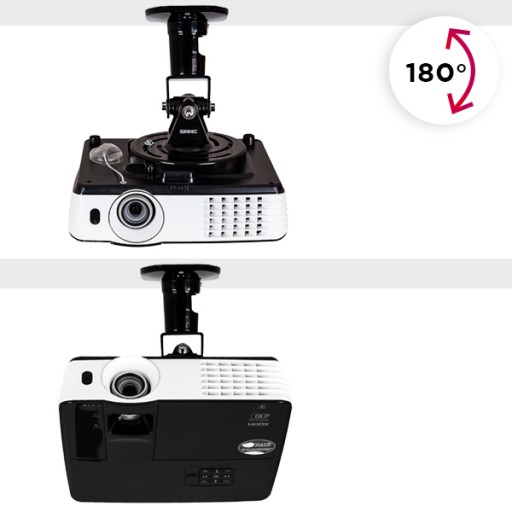 - Uchwyt sufitowy (ścienny) z możliwością regulacji kąta nachylenia. Przechył w pionie oraz w poziomie o łącznie 180° oraz obrót o 360 ° względem własnej osi. Po zamontowaniu dystans pomiędzy sufitem a projektorem wynosi tylko 218 mm.