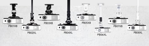 - Nasze modele uchwytów są kompatybilne z prawie wszystkimi rzutnikami dostępnymi na rynku (z wyjątkiem bardzo specyficznych i rzadkich projektorów, które nie dozwalają na bezpośredni montaż sufitowy lub ścienny i wymagają zakupu dodatkowego adaptera dostępnego na innych aukcjach). Nasze wieszaki umożliwiają instalację projektorów z 3 lub 4 otworami montażowymi.