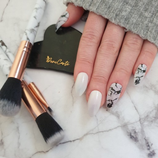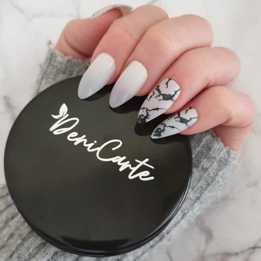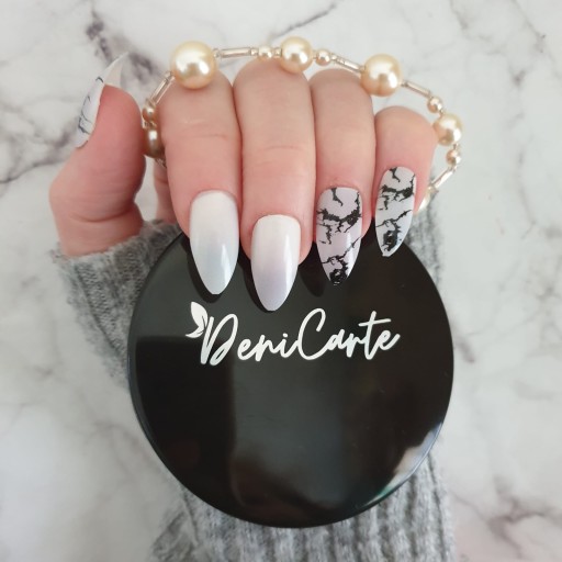 ✔️Wybrany model jest w pięknym błyszczącym kolorze z motywem marmurka. Paznokcie w kształcie migdała.