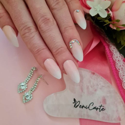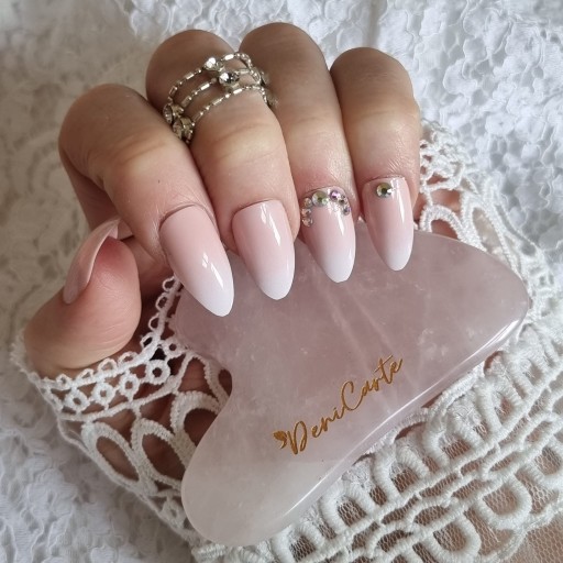 ✔️Wybrany model jest w pięknym błyszczącym pudrowo różowym kolorze o kształcie migdała, z efektem french / baby boomer oraz ozdobnymi cyrkoniami.