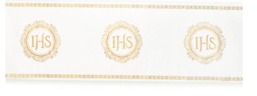 Bieżnik z organzy w kolorze białym, ozdobiony złotym napisem IHS.