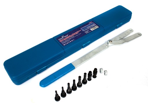 Klucz do napinania koła pasowego marki Falon-Tech. Klucz jest używany w serwisach motoryzacyjnych, warsztatach samochodowych do naprawy silnika, wymiany pasków klinowych, pasków rozrządu i pomp wtryskowych.