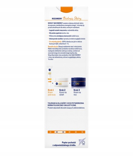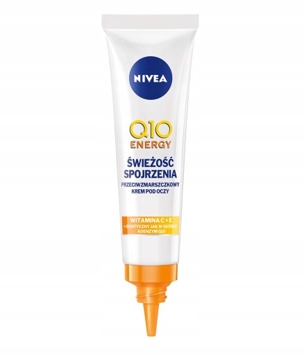 Poznaj NIVEA Q10 Energy Świeżość Spojrzenia Przeciwzmarszczkowy krem pod oczy, który wspiera własną zdolność skóry do poprawy metabolizmu energetycznego* i chroni ją przed szkodliwymi dla skóry wolnymi rodnikami. NIVEA krem pod oczy łączy w sobie siłę 3 antyoksydandów: Koenzymu Q10 w 100% identycznego jak w skórze oraz Witamin C i E. Krem do twarzy z witaminą C łagodzi oznaki zmęczenia i rozświetla cerę, zapewniając Twoim oczom spojrzenie pełne blasku. Przeciwzmarszczkowy krem pod oczy sprawia, że skóra wokół oczu jest bardziej jędrna, a z zmarszczki i kurze łapki wokół oczu wyraźnie mniej widoczne. Intensywnie nawilża skórę zapewniając jej świeżość. Dzięki owocowemu zapachowi z naturalnym wyciągiem z pomarańczy i lekkiej formule jest wyjątkowo przyjemny w stosowaniu. Tolerancja dla skóry i oczu potwierdzona dermatologicznie i okulistycznie.