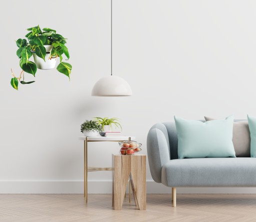 Niewidoczny montaż, ukryty za doniczką - kwiaty doniczkowe umieszczone na wieszaku tworzą imponujący efekt zawieszenia w powietrzu.