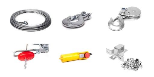 - W zestawie wyciągarka, pilot sterujący, zblocze hakowe, instrukcja, gwarancja, śruby, uchwyty montażowe