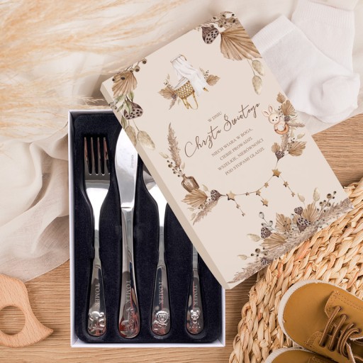 - Sztućce zapakowane są w ozdobne pudełko, na którym umieścimy życzenia na Chrzest Święty.