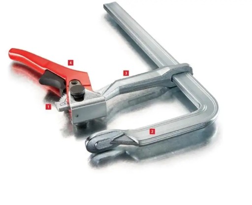 Malowana proszkowo dźwignia mocowania i luzowania posiadaszczególnie ergonomiczny kształt.Powleczony tworzywem sztucznym przycisk zwalniający posiada zabezpieczenie przed ześlizgiwaniem się ręki, gwarantując bezpieczeństwo podczas luzowania ścisku.