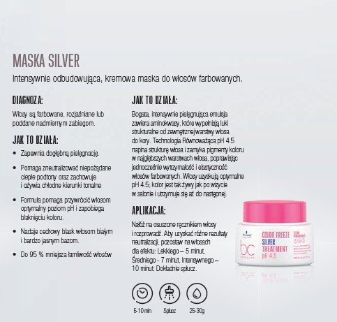 Maska do włosów farbowanych Schwarzkopf BC Color Freeze Silver zapewnia dogłębną pielęgnację i pomaga w neutralizacji niepożądanych ciepłych tonów na włosach. Kosmetyk ochładza kolor włosów i przywraca im optymalne pH. Dzięki temu kolor nie blaknie. Maska nadaje cedrowy blask włosom białym i bardzo jasnym bazom. Pasma odzyskują elastyczność i głębię koloru. Maska zmniejsza do 95% łamliwość włosów.