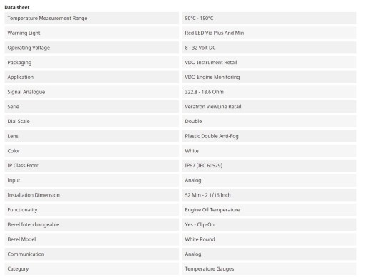 Wskaźnik temperatury oleju VDO VievLine Engine Oil Temperature 150°C White 52 mm