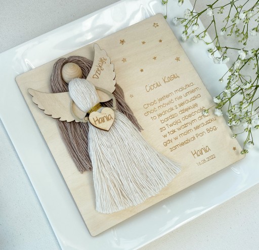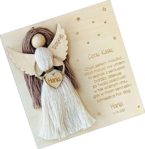 Drewniana kartka z podziękowaniami oraz aniołek wykonany z bawełnianego sznurka.