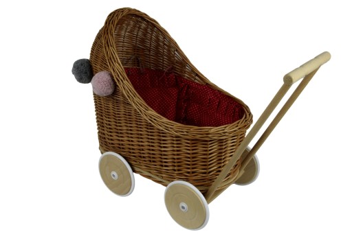 Wiklinowy wózek z pościelą czerwoną w kropki i pomponami - idealna zabawka dla najmłodszych pociech. Może posłużyć do przewożenia lalek, misiów lub innych zabawek.