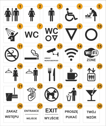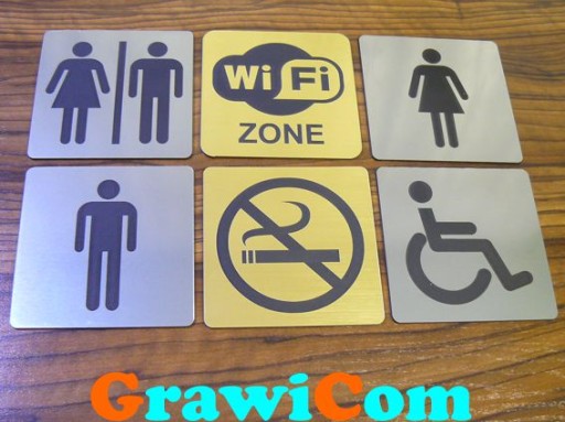 Jeżeli chcą Państwo zamówić tabliczki inne niż "WC", prosimy o podanie konkretnych wzorów z zamieszczonego na aukcji wzornika. To samo tyczy się koloru laminatu grawerskiego - jeżeli ma być inny niż srebrny szczotkowany (A6), prosimy podać konkretny kolor ze wzornika.
