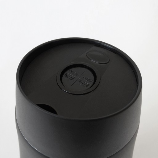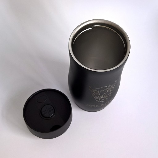 Kuber termiczny , wewnątrz i na zewnątrz ze stali nierdzewnej, plastikowe odkręcane niekapiące wieczko z przyciskiem OPEN/CLOSE i wbudowanym otworem do picia, gumowany spód dla lepszej przyczepności, pojemność ok. 380 ml.