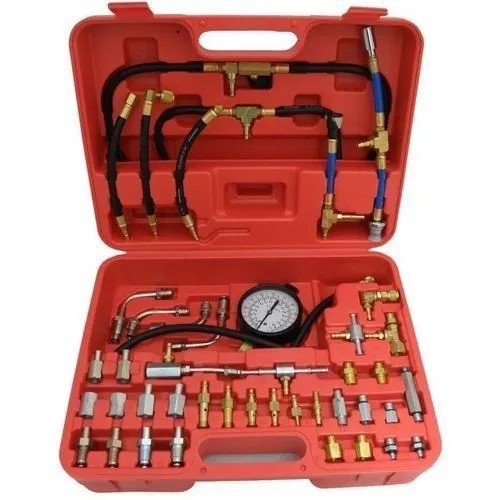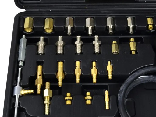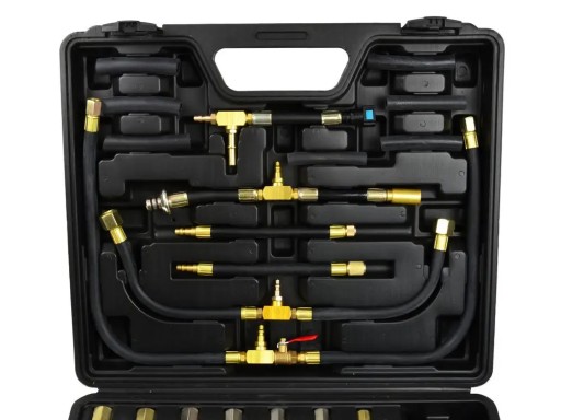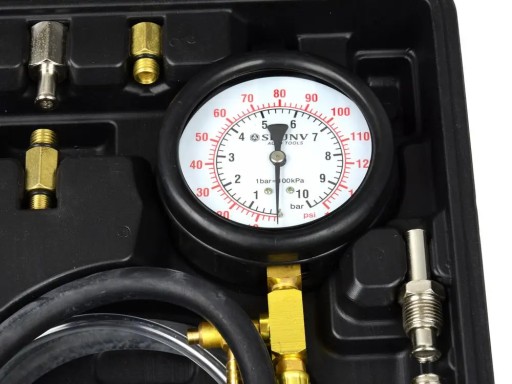 Wielofunkcyjny zestaw do pomiaru ciśnienia spalania benzyny. Zestaw współpracuje z większością samochodów marek japońskich, amerykańskich i europejskich. Zestaw zawiera adaptery i kształtki pasujące do większości układów wtrysku paliwa. Manometr z podwójną skalą: 0 - 140 psi oraz 0 - 10 bar. Długi elastyczny przewód wraz zaworem odpowietrzającym pozwala na bezpieczny pomiar ciśnienia.