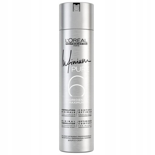 Lakier L'Oreal Professionnel Infinium Pure, zapewnia mocne utrwalenie. Przeznaczony do upięć, koków oraz mocnego modelowania fryzury. Lakier nie pozostawia białych śladów, oraz nie skleja włosów. Nadaje natychmiastowy blask, oraz utrwalenie bez sztywności. Jego sekretem jest dyfuzor zapewniający wyjątkowe rozproszenie lakieru na profesjonalnym poziomie. Włosy stają się błyszczące bez efektu zmatowienia.