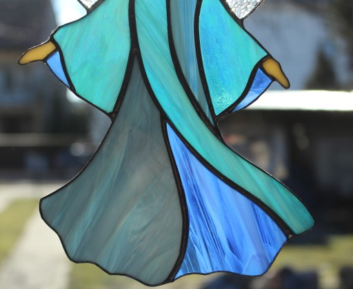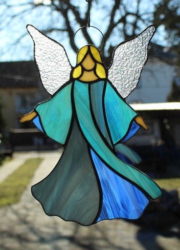Anioł wygląda inaczej w zależności od pory dnia i oświetlenia. Użyte szkło przepuszcza światło, a jego faktura łamie je nadając ozdobie niepowtarzalnego charakteru.