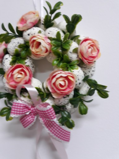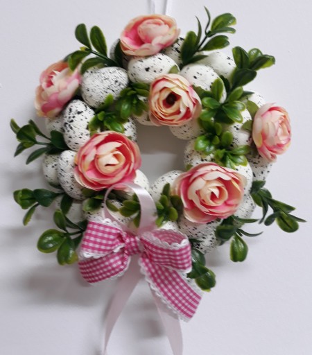 - Piękny dekoracyjny wianek ze styropianowymi jajkami, przyozdobiony gałązkami bukszpanu, peoniami oraz ozdobną kokardą.